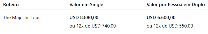 - Gorjetas para guia e motorista: USD 100 por pessoa;