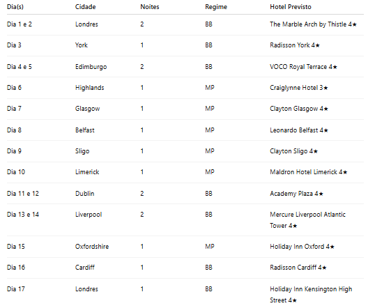 - 6 jantares no hotel (bebidas não incluídas) conforme programa: Terras Altas, Glasgow, Belfast, Sligo, Limerick e Oxford;