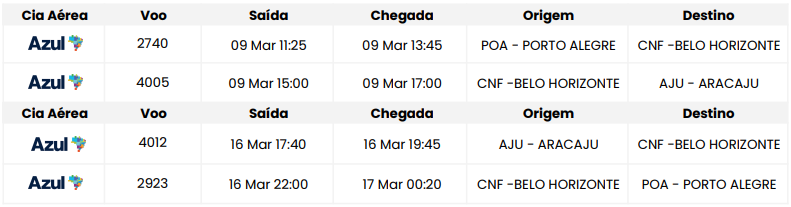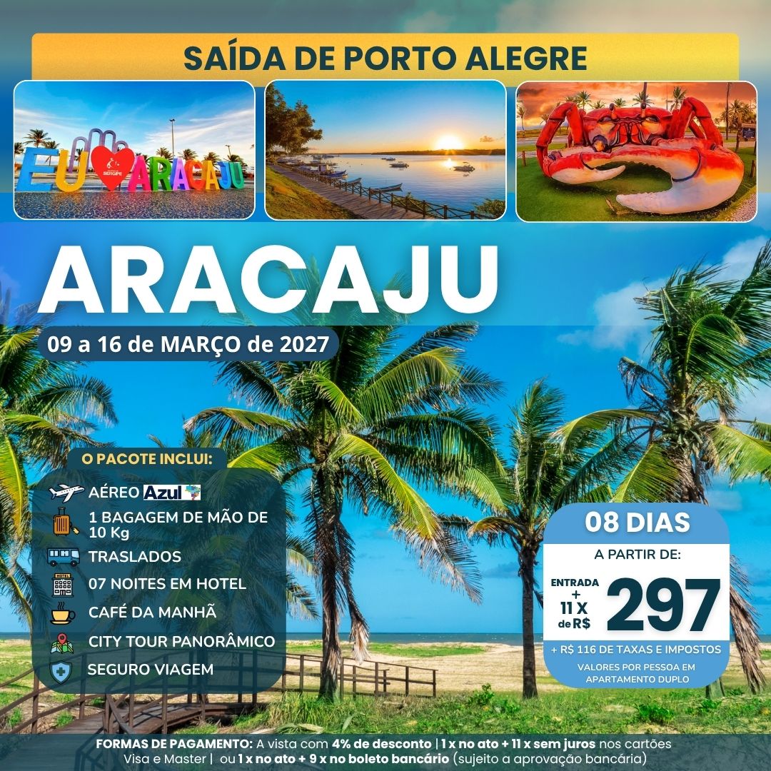 - Passagem aérea de ida e volta: Porto Alegre / Aracaju / Porto Alegre, com uma bagagem de mão de 10Kg;
