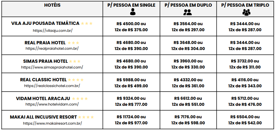 - Traslado regular de chegada e saída: Aeroporto / Hotel em Aracaju / Aeroporto;