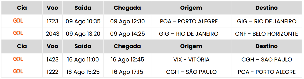 - Passagem aérea com a GOL, no trecho Porto Alegre / Belo Horizonte // Vitória / Porto Alegre, com franquia de 01 mala despachada de até 23 kg;