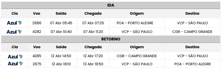- Passagem aérea AZUL: Porto Alegre / Campo Grande / Porto Alegre, com 1 bagagem de mão de 10Kg;