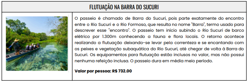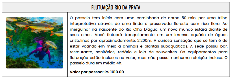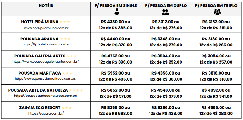 - Valores em reais e por pessoa;