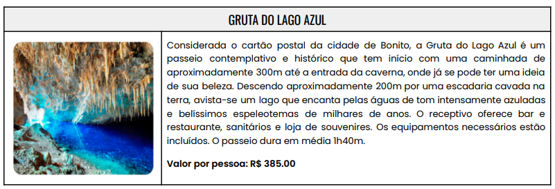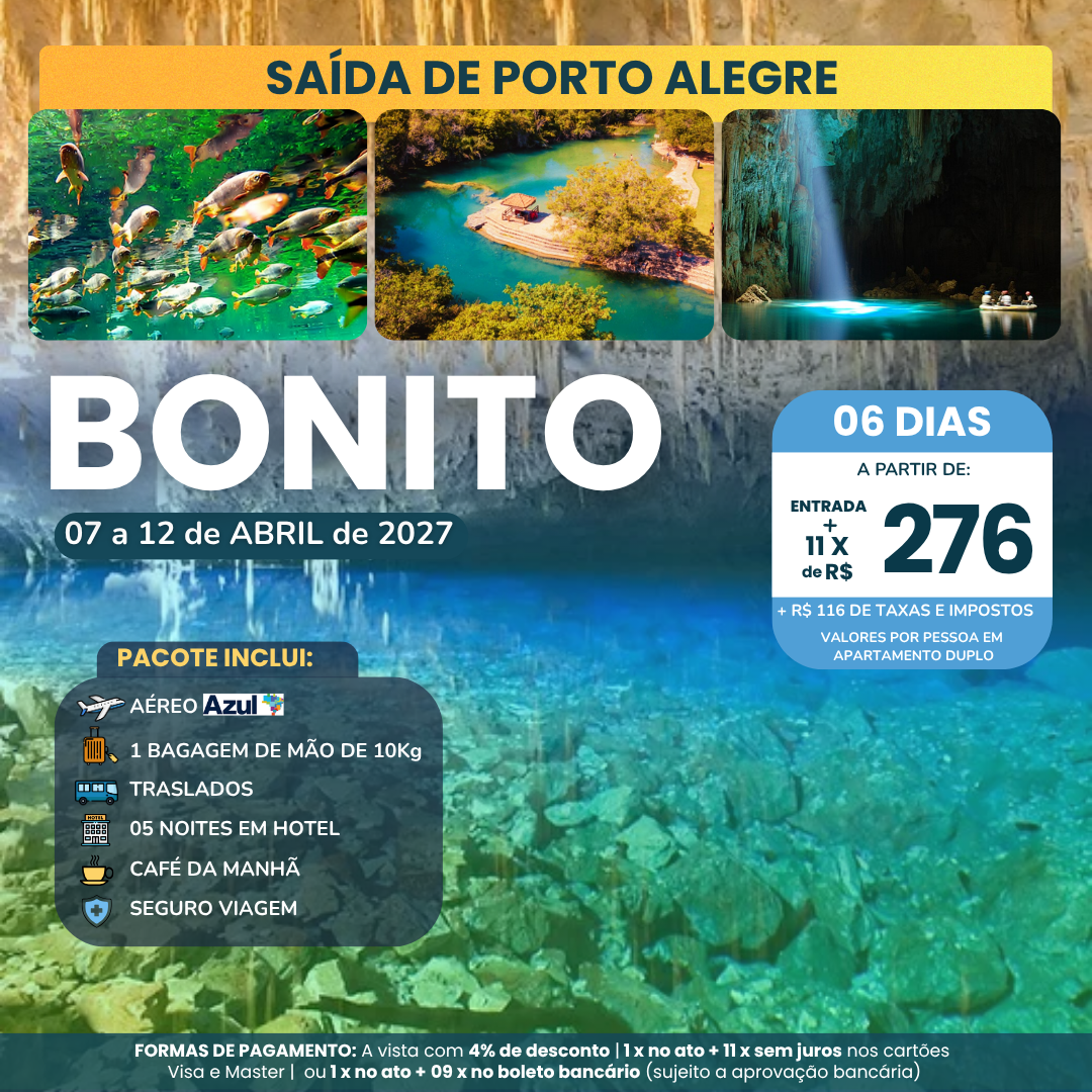 - 05 noites de hospedagem em Bonito com café da manhã de 07 a 12 de ABRIL de 2027;