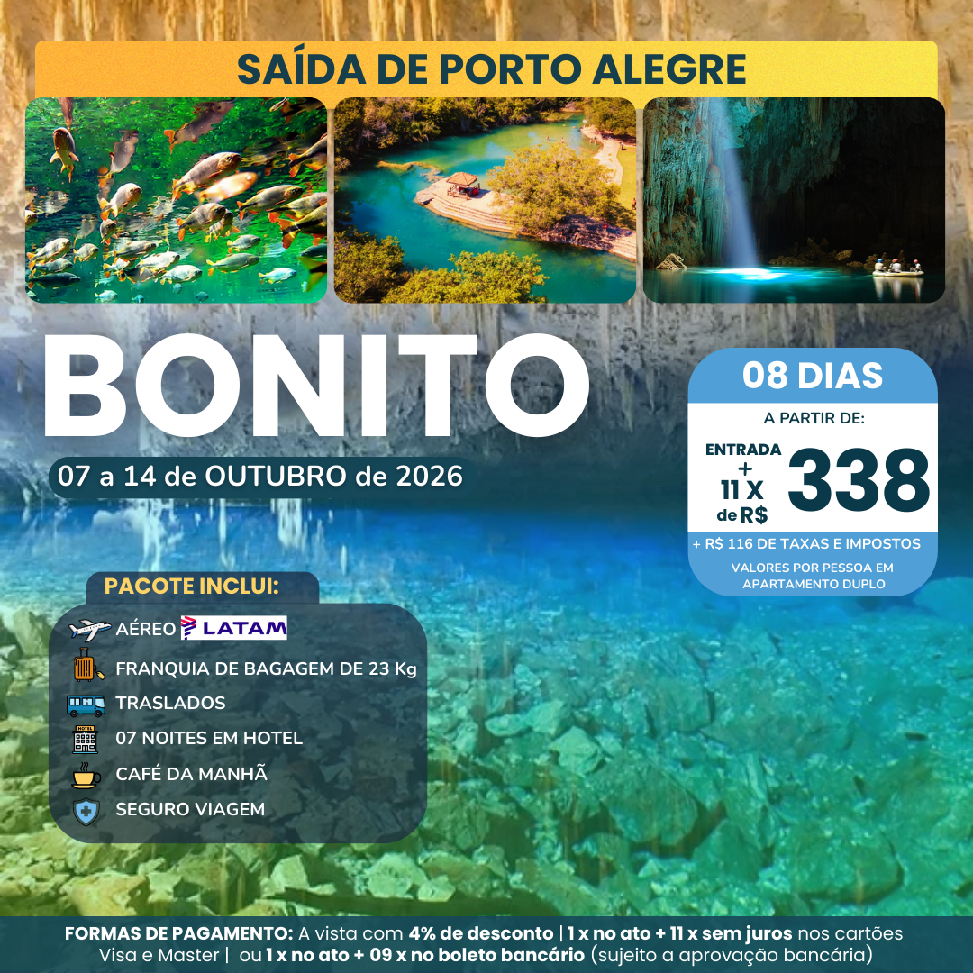 ➔ Passagem aérea LATAM: Porto Alegre / Bonito / Campo Grande / Porto Alegre, com franquia de 1 mala
