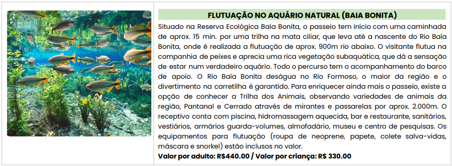 - Traslado regular: Aeroporto em Bonito / Hotel em Bonito / Aeroporto em Bonito;