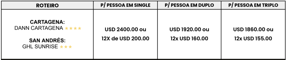 - 04 noites de hospedagem em Cartagena, com café da manhã, de 19 a 23 de setembro;