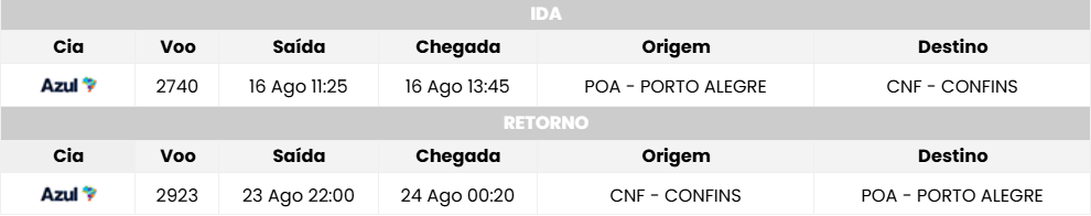 - Passagem aérea AZUL, (voo direto): Porto Alegre / Belo Horizonte / Porto Alegre. Franquia de bagagem de 1 peça de 23Kg;