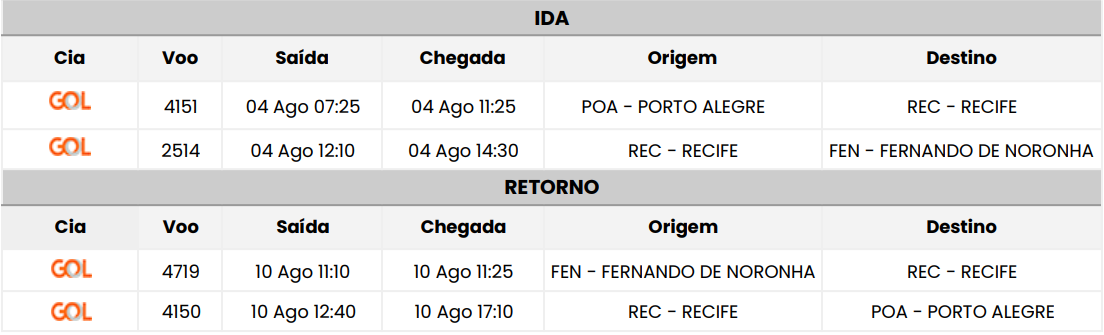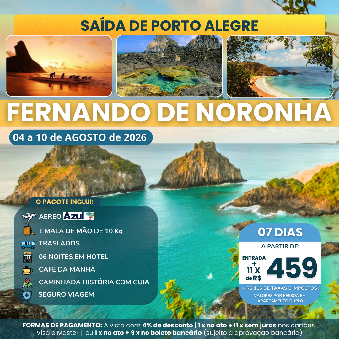 • Passagem aérea de ida e volta: Porto Alegre / Fernando de Noronha / Porto Alegre, com uma mala de mão de 10Kg;