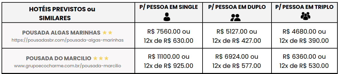 - Valores sujeitos a alteração conforme disponibilidade de hotel;