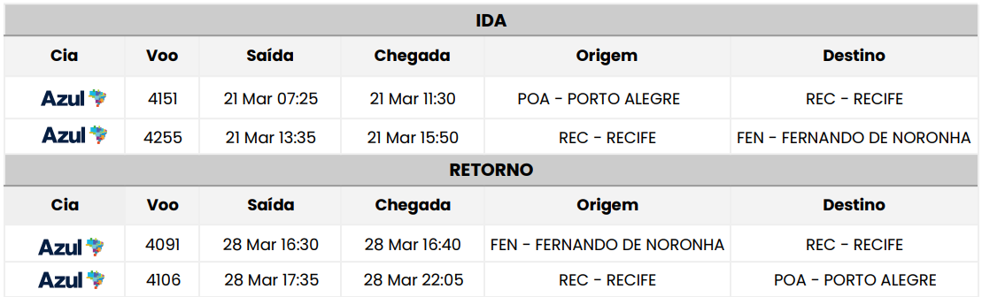 - Passagem aérea de ida e volta: Porto Alegre / Fernando de Noronha / Porto Alegre, com uma mala de mão de 10Kg;
