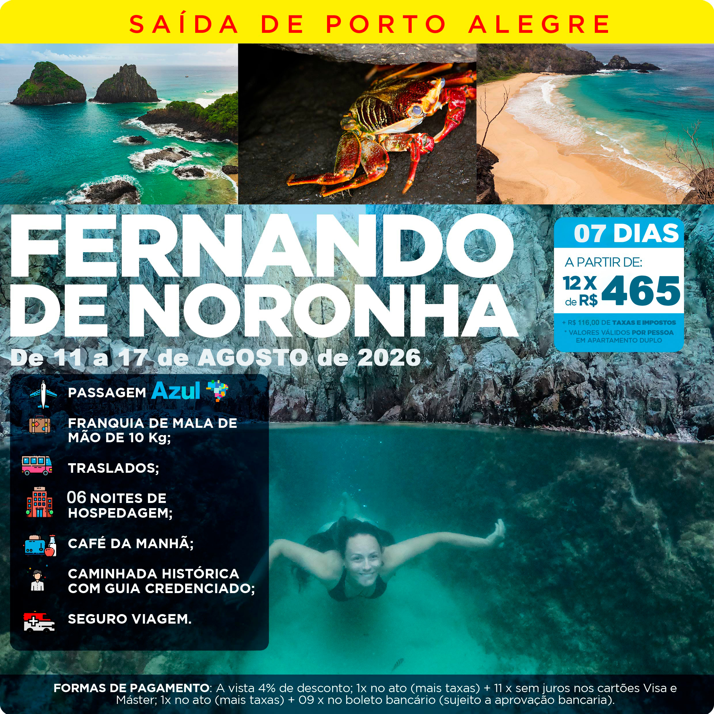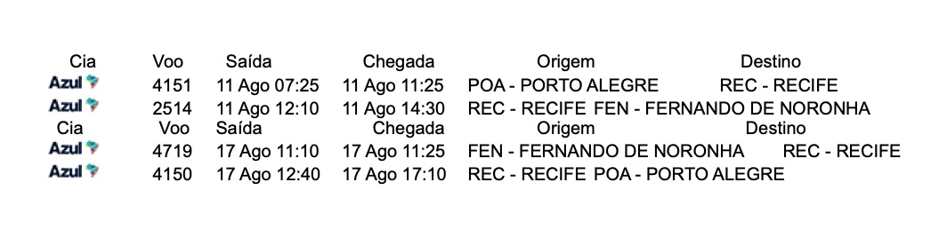 • Passagem aérea AZUL Porto Alegre / Fernando de Noronha / Porto Alegre com franquia de um bolso de mão de 10 quilos;
