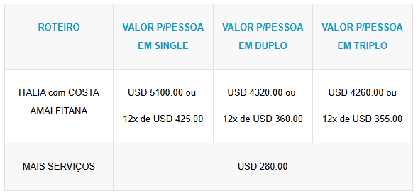 - Valores em dólares americanos e por pessoa;
