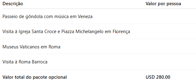 - Acrescentar USD 260.00 de taxas de embarque a serem pagas junto à entrada;