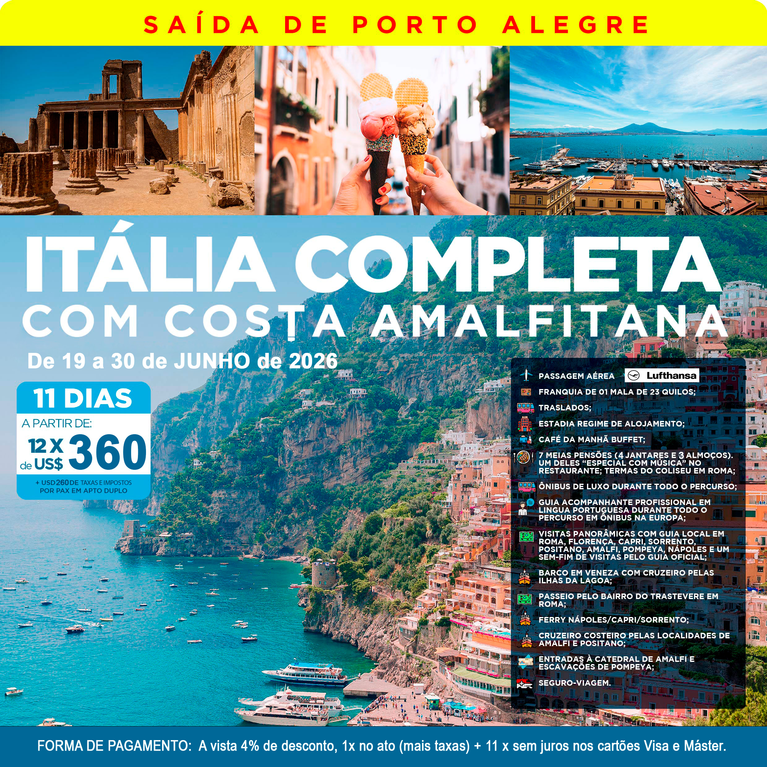 - Passagem aérea em classe Econômica pela Porto Alegre / MILÃO — ROMA/ Porto Alegre com franquia de 01 peça de 23 quilos;