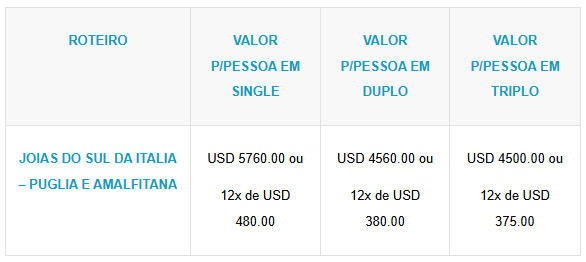 - Valores em dólares americanos e por pessoa;