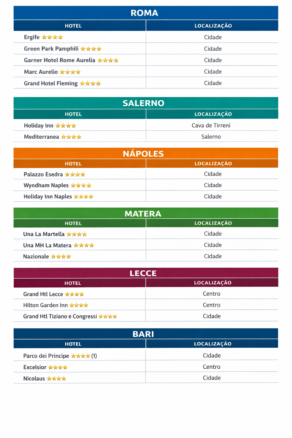 • Visitas panorâmicas com guia local em Roma, Capri, Sorrento, Positano, Amalfi, Pompeia, Nápoles, Matera, Lecce e Bari, além de diversas visitas acompanhadas pelo guia durante o percurso;