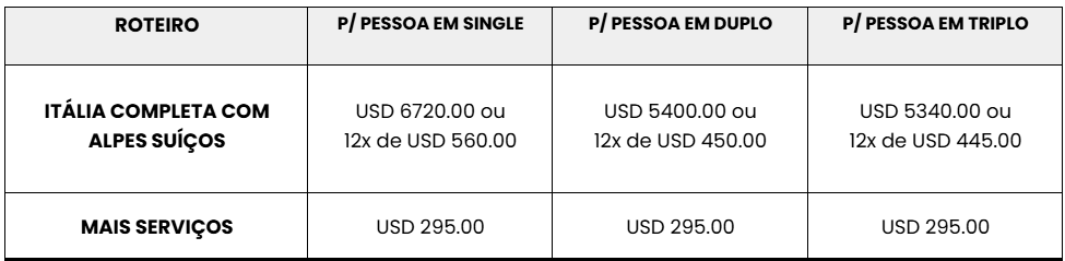 - Passagem aérea em classe econômica, no trecho Porto Alegre / Milão – Roma / Porto Alegre, com franquia de 1 bagagem despachada de até 23 kg;