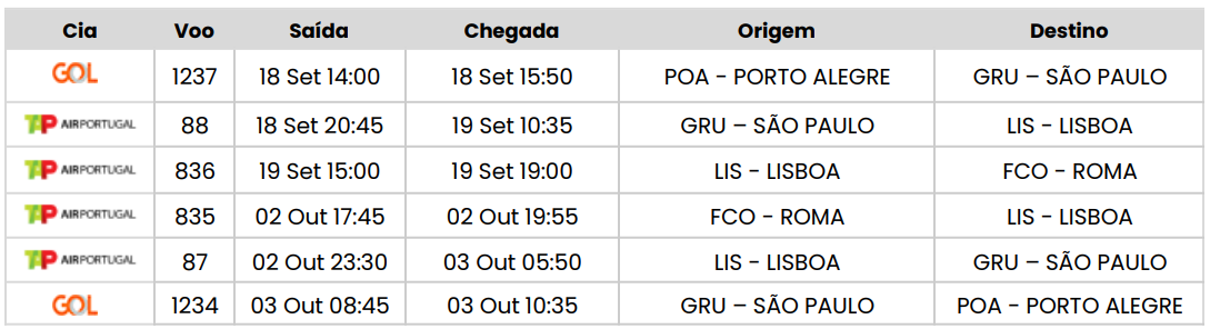 - Passagem aérea em classe econômica com a TAP Air Portugal, na rota Porto Alegre / Roma / Porto Alegre, com franquia de 1 bagagem de 23kg;