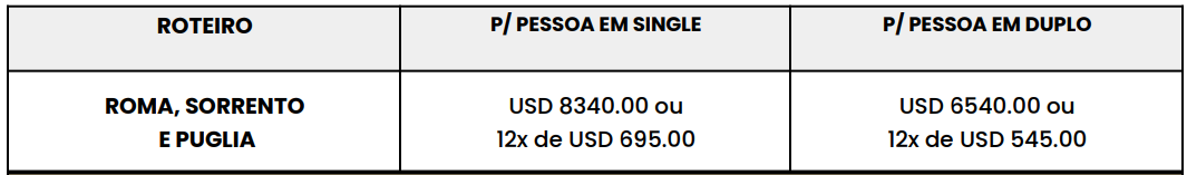 Uma viagem fascinante pela Itália, unindo história, cultura e paisagens inesquecíveis. Em Roma, a “Cidade Eterna”, você poderá explorar ícones como o Coliseu e o Vaticano, além de vivenciar todo o charme de suas ruas e praças. O roteiro segue pelo sul, passando por Sorrento e pela deslumbrante Capri, com cenários à beira-mar de tirar o fôlego. Na região da Puglia, cidades como Bari, Alberobello e Lecce revelam tradições, arquitetura única e o melhor da gastronomia local, enquanto Matera impressiona com suas construções milenares. Uma experiência completa, que combina cenários encantadores, sabores autênticos e a essência do sul da Itália.