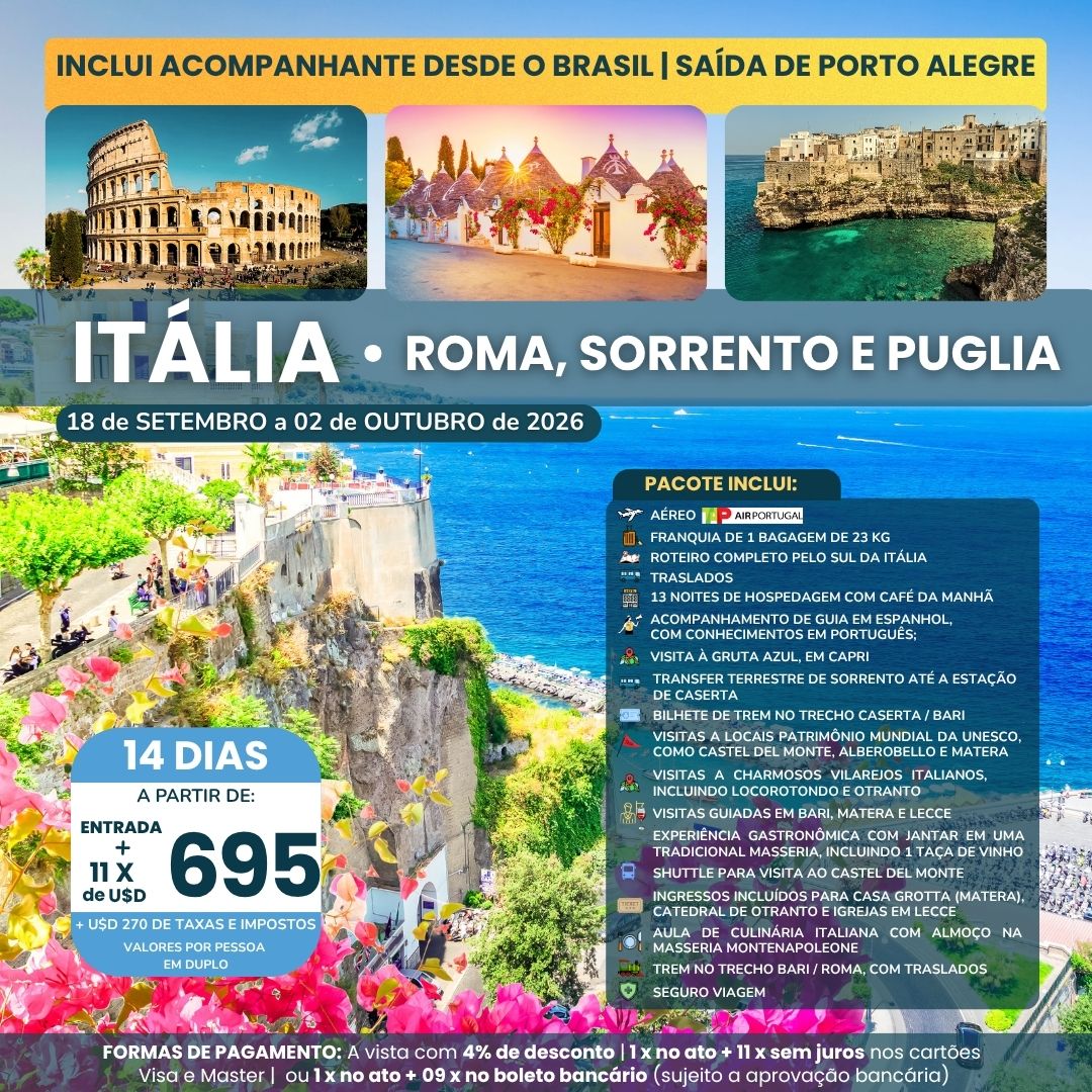 Uma viagem fascinante pela Itália, unindo história, cultura e paisagens inesquecíveis. Em Roma, a “Cidade Eterna”, você poderá explorar ícones como o Coliseu e o Vaticano, além de vivenciar todo o charme de suas ruas e praças. O roteiro segue pelo sul, passando por Sorrento e pela deslumbrante Capri, com cenários à beira-mar de tirar o fôlego. Na região da Puglia, cidades como Bari, Alberobello e Lecce revelam tradições, arquitetura única e o melhor da gastronomia local, enquanto Matera impressiona com suas construções milenares. Uma experiência completa, que combina cenários encantadores, sabores autênticos e a essência do sul da Itália.