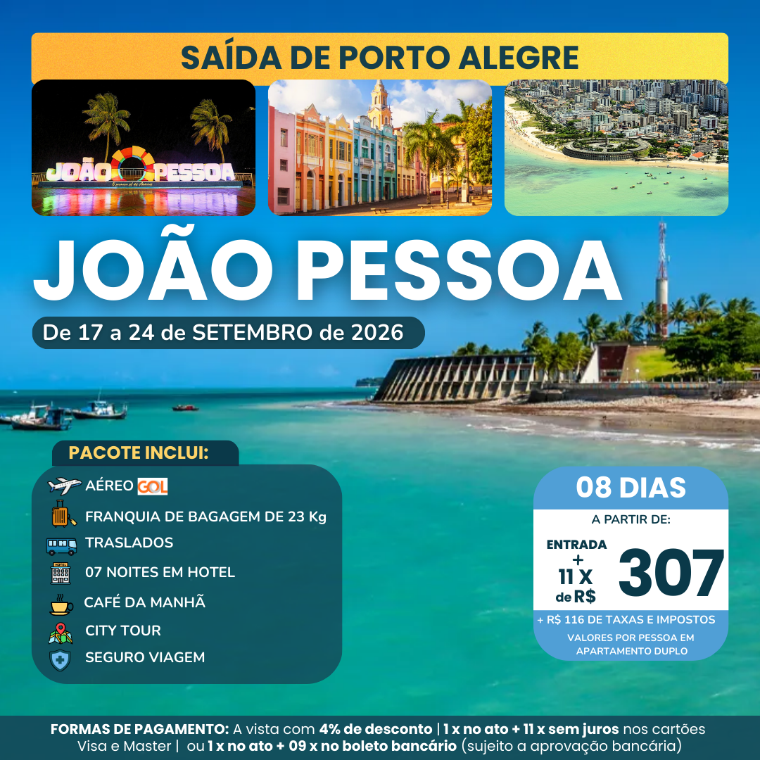 - Passagem aérea LATAM: Porto Alegre / João Pessoa / Porto Alegre, com franquia de 1 mala despachada de 23 kg;