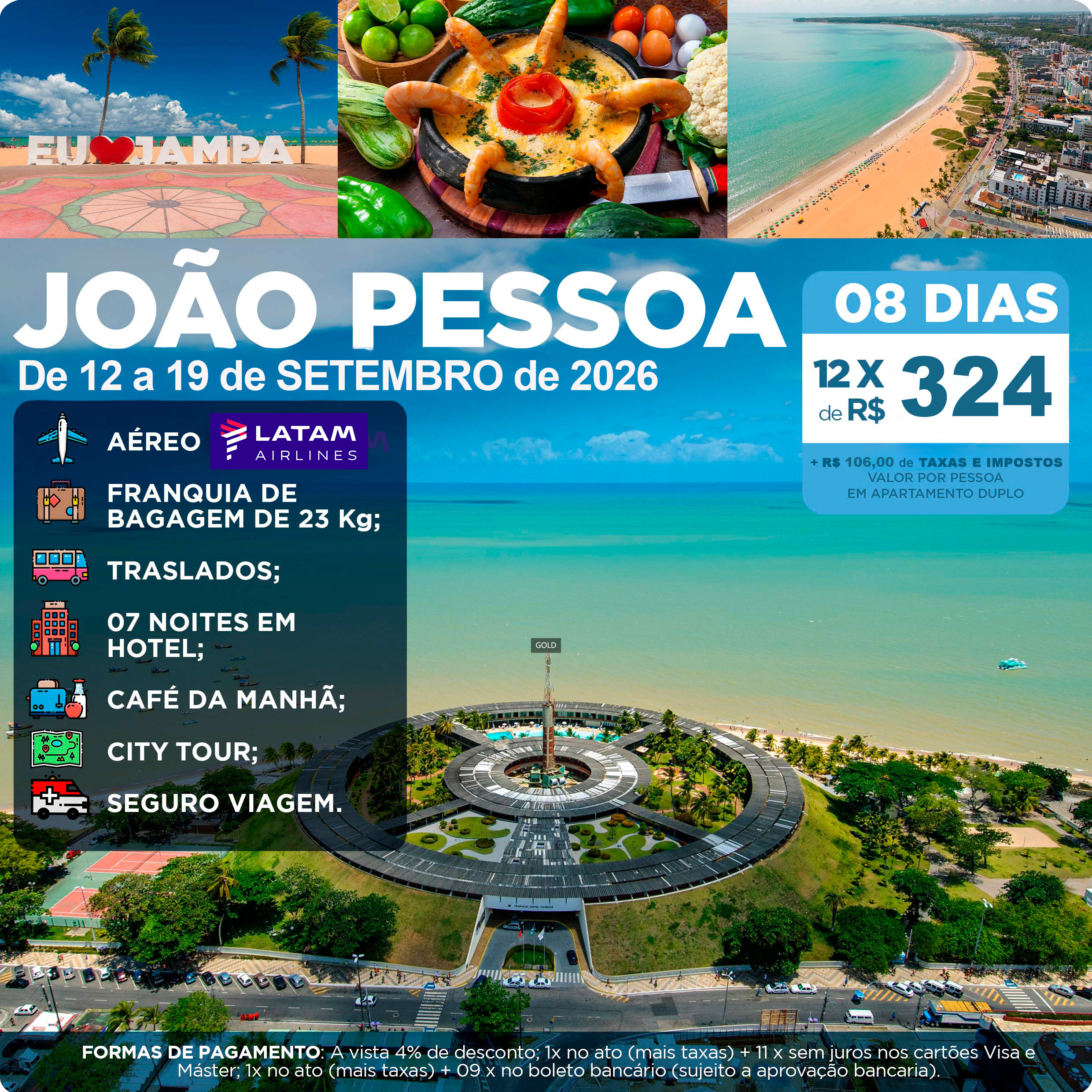 - 07 noites de hospedagem em João Pessoa com café da manhã de 12 a 19 de SETEMBRO de 2026;