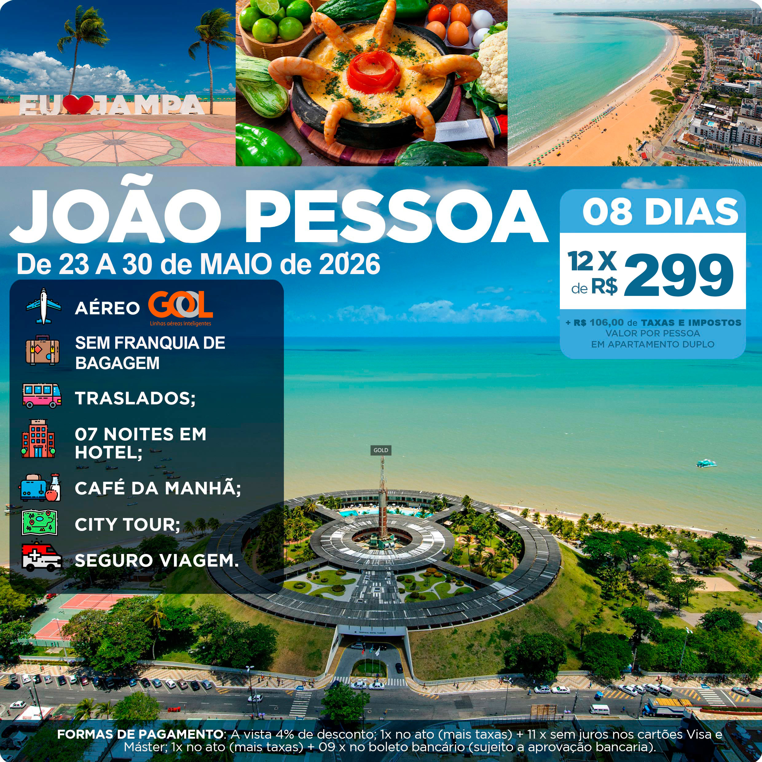 - 07 noites de hospedagem em João Pessoa com café da manhã de 23 a 30 de MAIO de 2026;