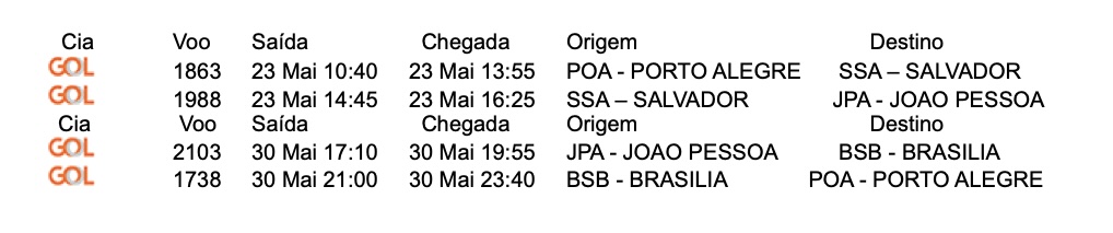 - Passagem aérea GOL: Porto Alegre / João Pessoa / Porto Alegre, sem franquia de bagagem;