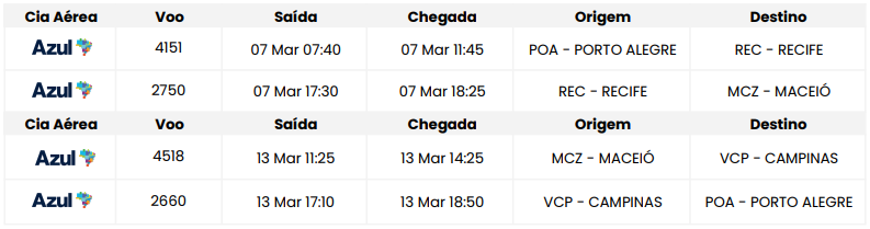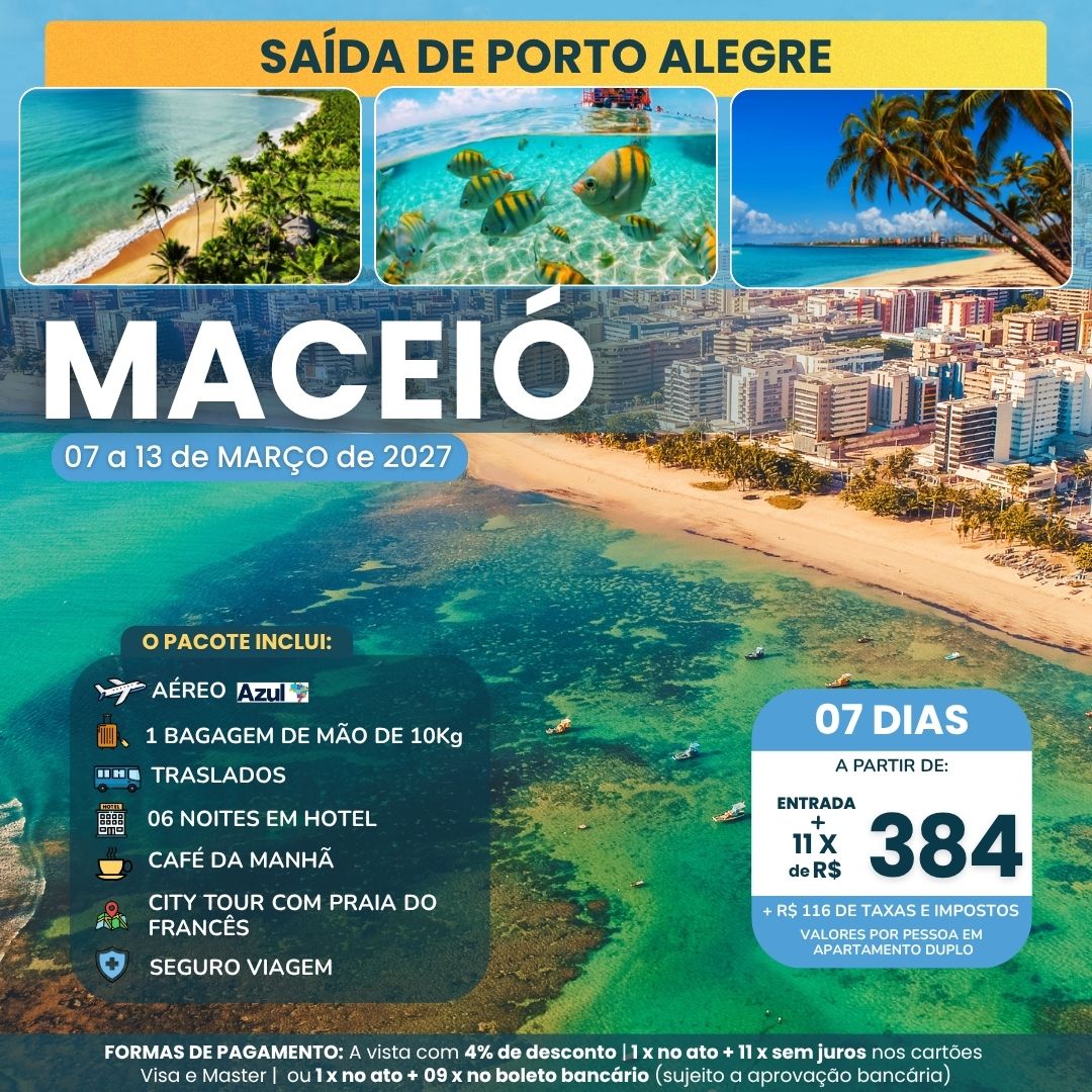 - Passagem aérea ida e volta: Porto Alegre / Maceió / Porto Alegre, com franquia de uma mala de mão de 10Kg;