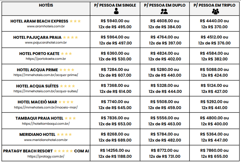 - Valores sujeitos a alteração conforme disponibilidade de hotel.