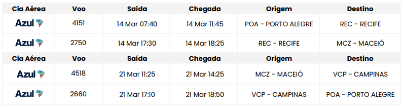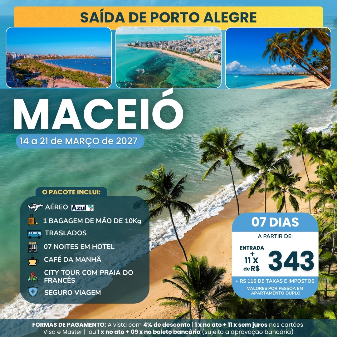 - Passagem aérea ida e volta: Porto Alegre / Maceió / Porto Alegre, com franquia de uma mala de mão de 10Kg;