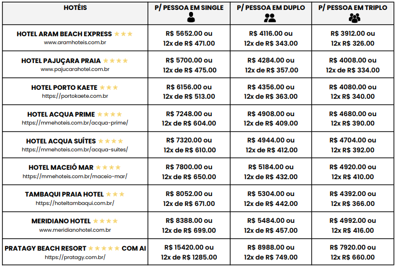 - Valores sujeitos a alteração conforme disponibilidade de hotel.