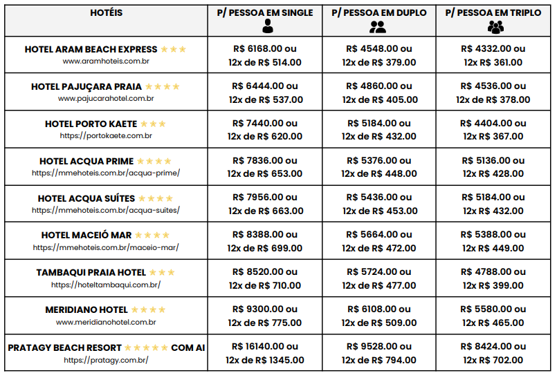- 07 noites de hospedagem em Maceió, com café da manhã, de 20 a 27 de MARÇO de 2027;