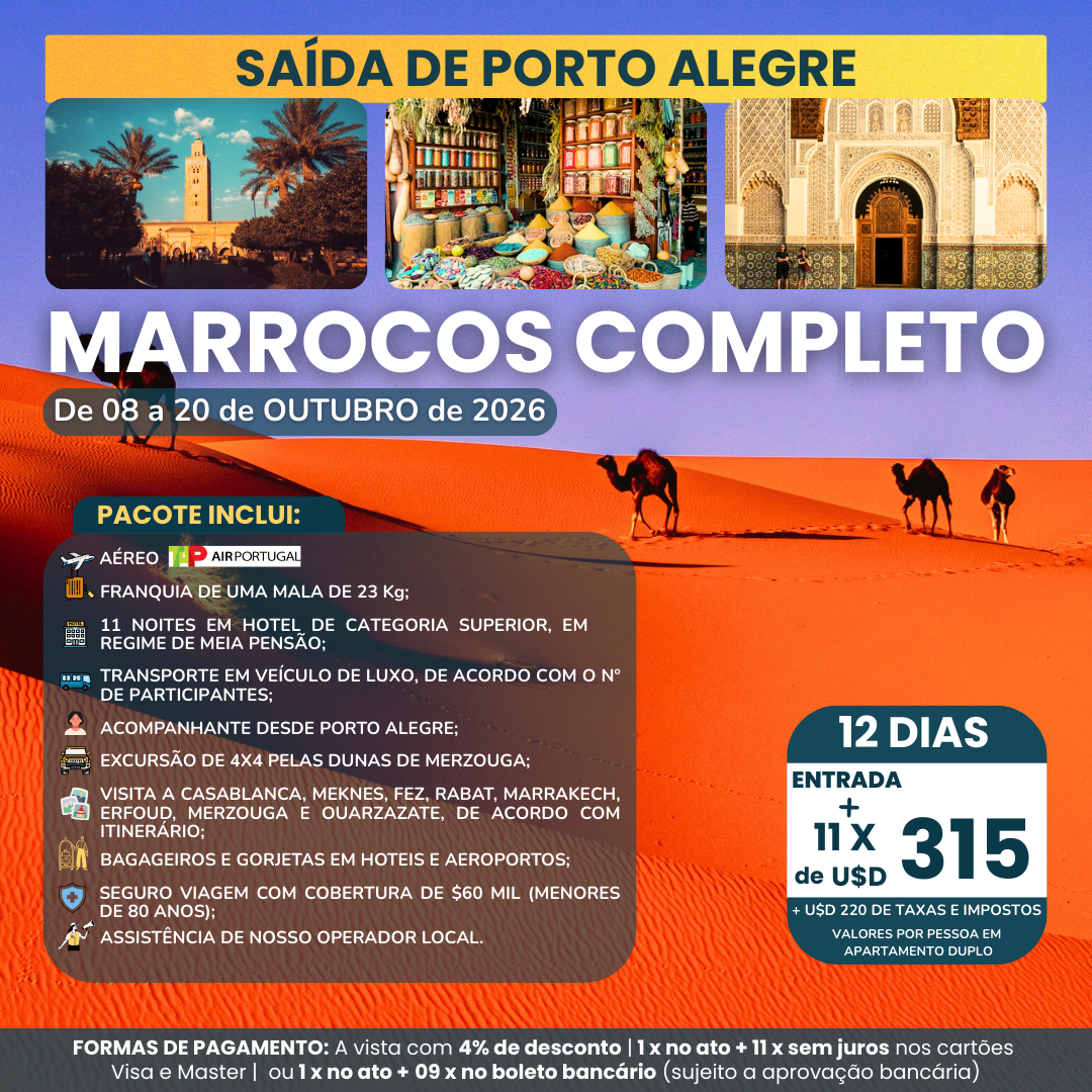 - Visita a Casablanca, Meknes, Fez, Rabat, Marrakech, Erfoud, Merzouga e Ouarzazate de acordo com o itinerário;