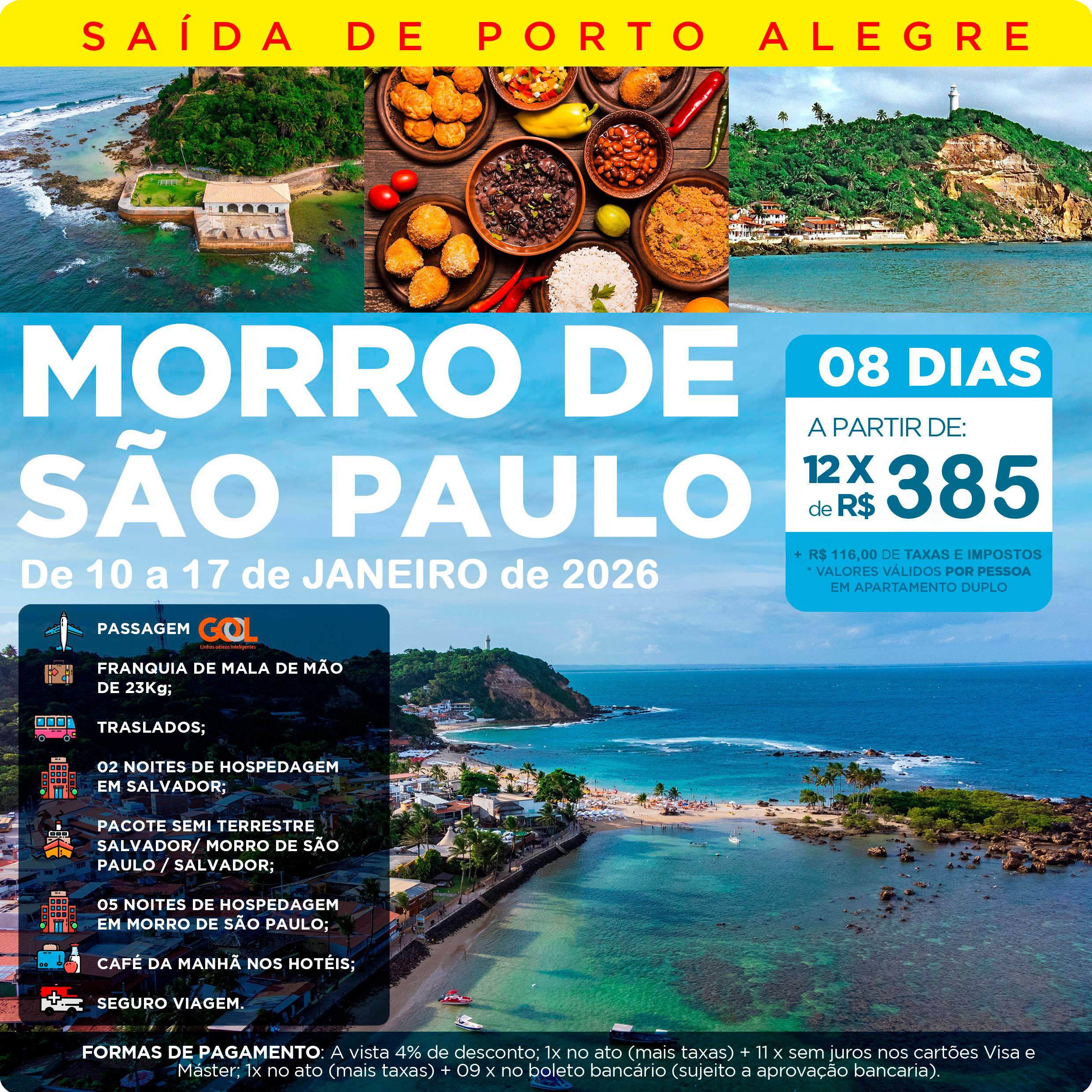 ➔05 noites de hospedagem em Morro de São Paulo, café da manhã, de 12 a 17 de JANEIRO de 2026;