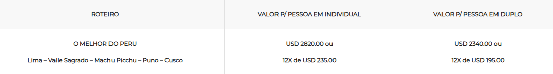 Acrescentar USD 145,00 de taxas de embarque por adulto a serem pagas na entrada.