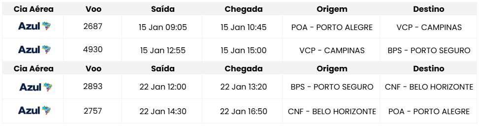 • Passagem aérea ida e volta: Porto Alegre / Porto Seguro / Porto Alegre, com franquia de uma mala de mão de 10Kg;
