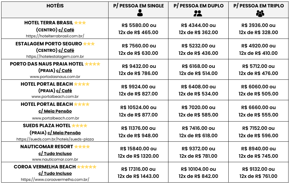 • 07 noites de hospedagem em Porto Seguro, com regime a definir, de 15 a 22 de JANEIRO de 2027;