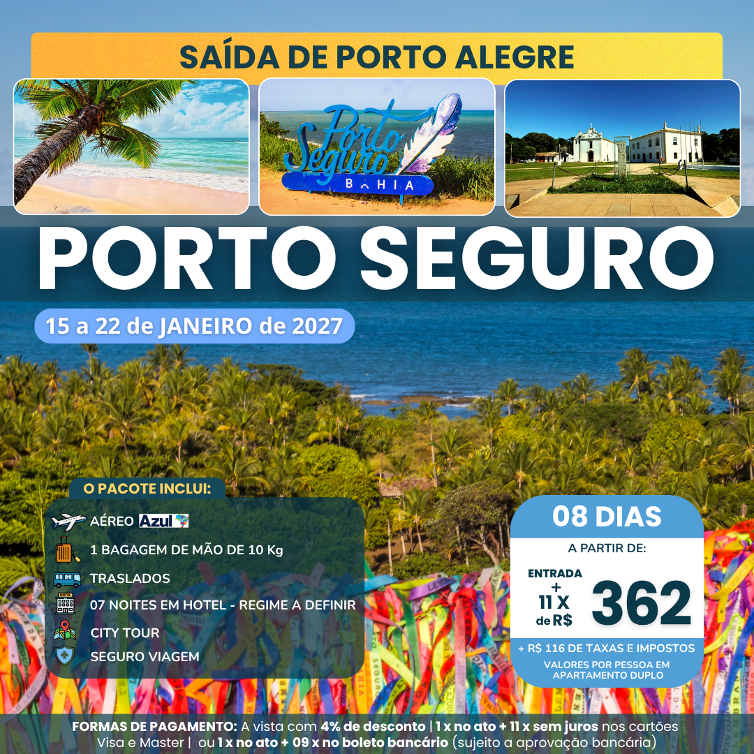 Desde os anos 1990, Porto Seguro tornou-se um destino muito procurado por jovens que estão concluindo o ensino médio, especialmente nos meses de julho e outubro. Porém, a cidade baiana vai além das festas e da famosa Passarela do Álcool, oficialmente chamada de Passarela do Descobrimento, e encanta com seu centro histórico, localizado no alto de um aclive, repleto de casinhas coloridas do período colonial e do marco do descobrimento, trazido de Portugal no início do século XVI. O litoral sul do estado completa o cenário com praias de beleza exuberante, como a Praia do Espelho e Trancoso, além de gastronomia variada e atividades para todas as idades, consolidando Porto Seguro como um dos principais destinos do país. Vamos?
