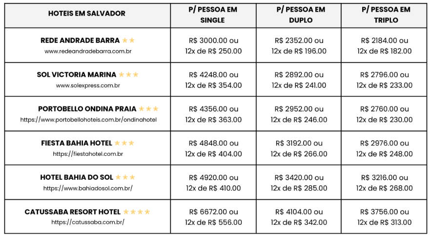 - 07 noites de hospedagem em Salvador, com café da manhã, de 20 a 27 de JUNHO de 2026;