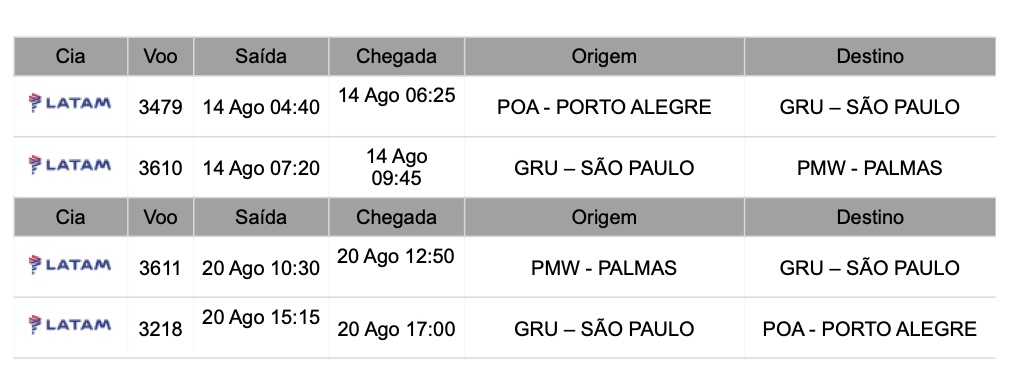 • Passagem aérea LATAM Porto Alegre / Palmas / Porto Alegre com franquia de um mala de 23 quilos;